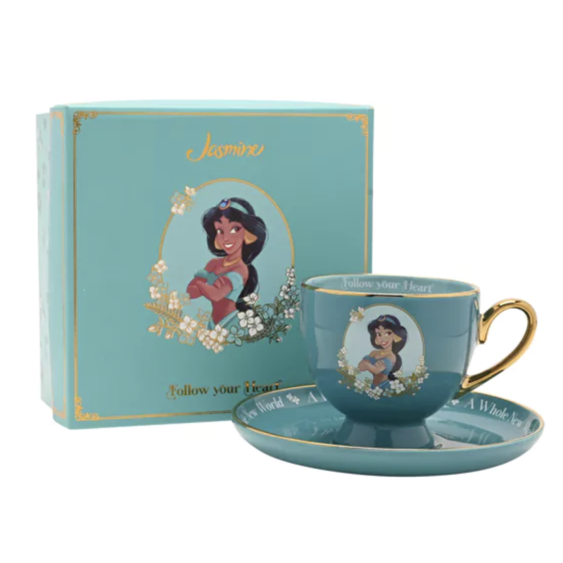 Create a royal tea experience with the Disney Pastel Princess Tea Cup & Saucer - Jasmine. This turquoise-coloured set showcases a delightful portrait of the iconic princess, surrounded by intricate floral designs. Brighten any morning with this charming teacup, featuring the uplifting message "Follow your Heart" printed on the cup. Perfect for any Disney fan, it's not just a teacup, but a keepsake to treasure.