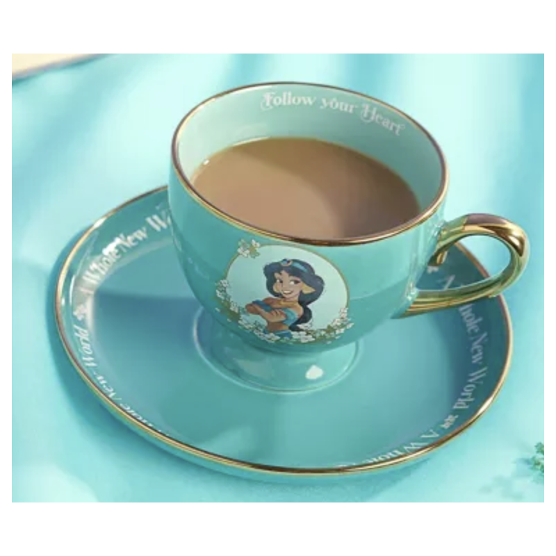 Create a royal tea experience with the Disney Pastel Princess Tea Cup & Saucer - Jasmine. This turquoise-coloured set showcases a delightful portrait of the iconic princess, surrounded by intricate floral designs. Brighten any morning with this charming teacup, featuring the uplifting message "Follow your Heart" printed on the cup.