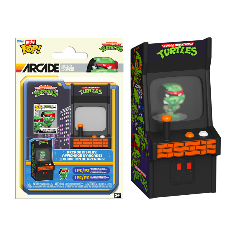 Remove Bitty Pop! Michelangelo from his case so he can take his place in the Bitty Pop! Arcade Display! The Bitty Pop! case can be stored inside the Bitty Pop! Arcade Display, directly below Pop! Michelangelo.
