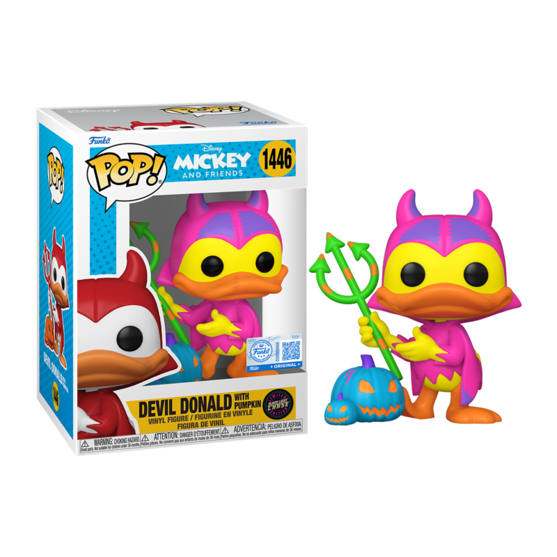 “Boy, oh boy!” Enjoy a night of trick-or-treating and jack-o-lantern carving alongside this exclusive Pop! Devil Donald with Pumpkin! Wearing his classic Halloween costume, complete with a pitchfork and cape, Pop! Donald Duck is ready to celebrate with his friends in your Disney collection. There’s a 1 in 6 chance you may find the black light chase of Pop! Devil Donald with Pumpkins.