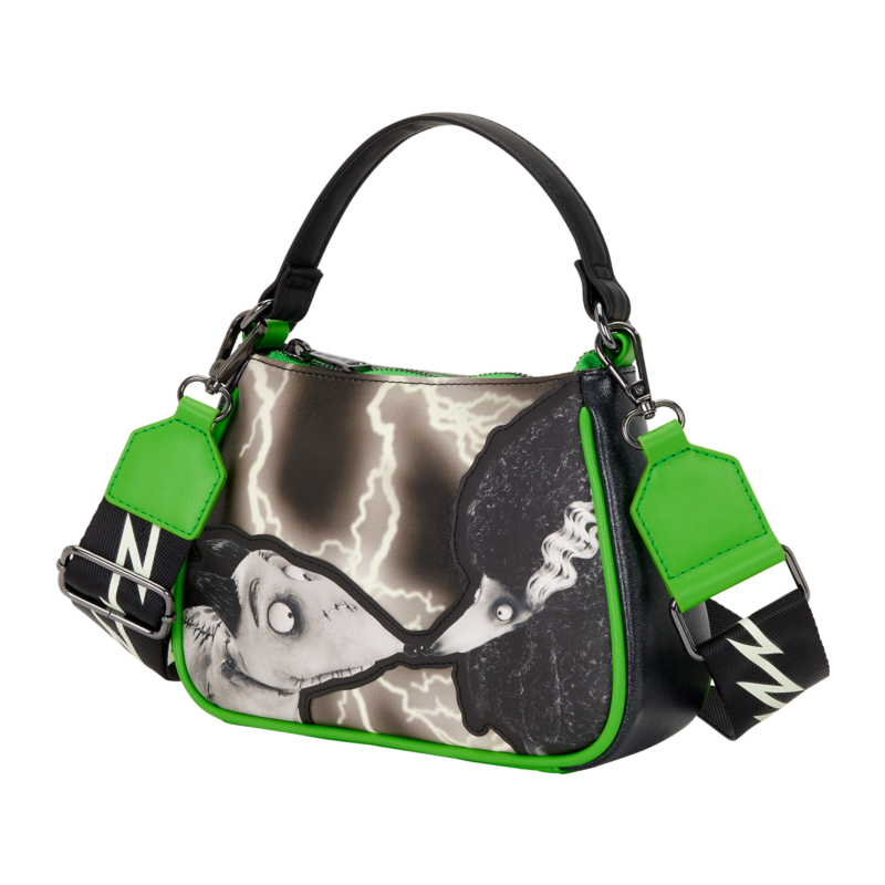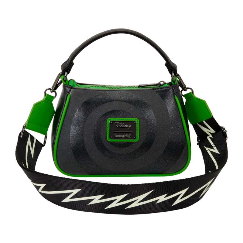 This crossbody bag features Sparky and Persephone from Frankenweenie. They're surrounded by glow-in-the-dark lightning strikes. Turn the bag around to find a swirling design that also glows in the dark. The adjustable crossbody strap has a lightning design on it.