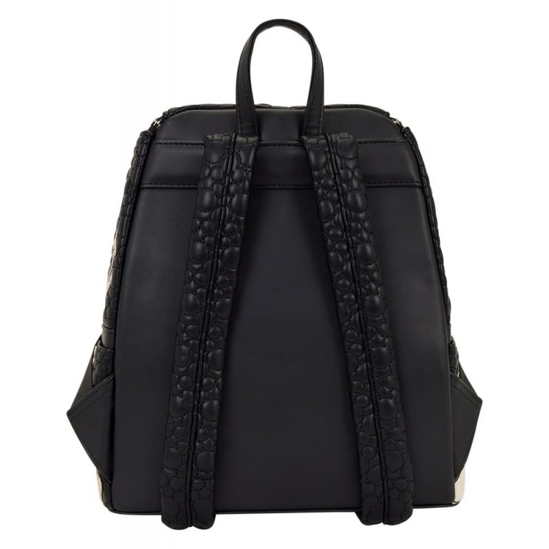This mini backpack features Mickey & Friends "sketched" on the bag against a quilted Mickey-silhouette background. You'll find Mickey on the front pocket while Minnie, Pluto, Goofy, and Donald are on the side pockets! On the top flap of the bag, you'll find a metal charm in the shape of a Mickey head surrounded on either side by embroidered leaves and flowers!