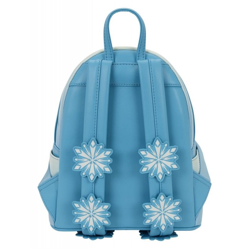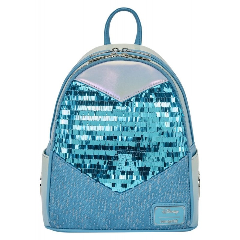 This cosplay bag is inspired by Disney's Princess Elsa! You'll find iridescent material, sequins, glitter, and tulle to bring her ensemble to life. A metal rivet on the side pocket features her silhouette. On the straps, you'll find applique snowflakes for an extra fun detail!