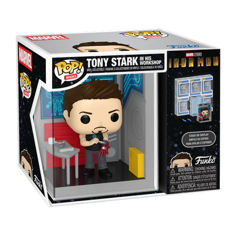 Carve out a corner of your collection for Pop! Nooks Tony Stark in His Workshop! This detailed 3D space is sure to make a stunning addition to your shelf, whether it’s nestled between your favourite books or showcased alongside the rest of your Marvel Studios’ Iron Man set! This collectible comes pre-packaged in an acrylic sleeve—perfect for stacking or displaying in your collection. Pop! bobblehead is adhered to the base and backdrop to ensure display integrity.