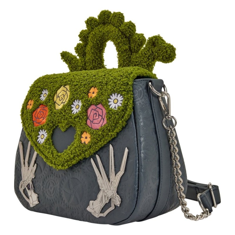 This crossbody bag features sherpa details modeling a hedge. It covers the front flap and there's a padded applique in the shape of a serpent. Embroidered roses cover the front flap and there's a heart-shaped cutout in the center. In the bottom corners, you'll find molded metal charms of Edward's scissor hands. A debossed pattern of gears against saffiano faux leather brings the whole look together.