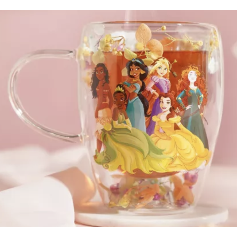 Step into the enchanting world of Disney with the Disney Pastel Princess Glass Mug with Dried Flowers - Multi Princess. Showcasing Ariel, Jasmine, Belle, and Merida in a vibrant burst of colours, nestled amidst a floral, nature-inspired backdrop. The dried flowers add a whimsical touch, making it a standout piece in any Disney collection. An ideal gift for Disney enthusiasts or a whimsical addition to any own collection.