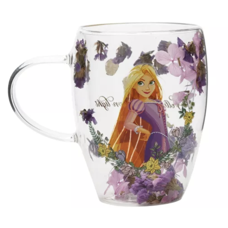 Step into the enchanting world of Disney with the Disney Pastel Princess Glass Mug with Dried Flowers - Rapunzel. This transparent glass mug showcases a colourful floral design, with a radiant image of Rapunzel amidst a blossoming field of purple and yellow flowers. An ideal gift for Disney enthusiasts or a whimsical addition to any own collection.