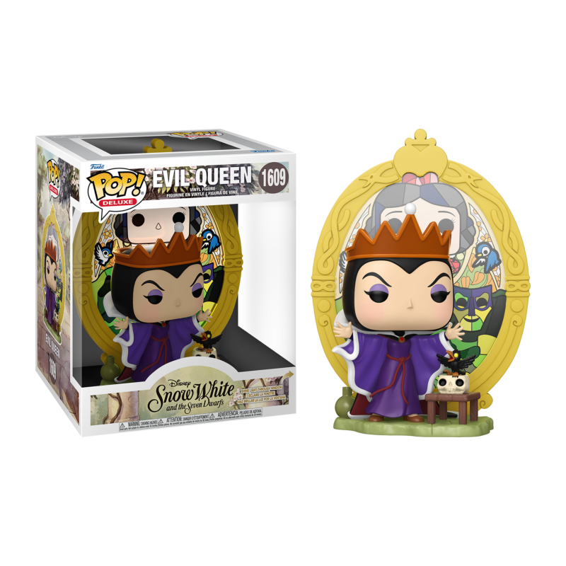 This Deluxe Pop! Vinyl Figure features the Evil Queen posed regally in front of a stained glass-style backdrop, rich with gothic detail and vibrant colour. With translucent elements that shine under light, it’s a bold and elegant centrepiece for any Disney Villains collection.