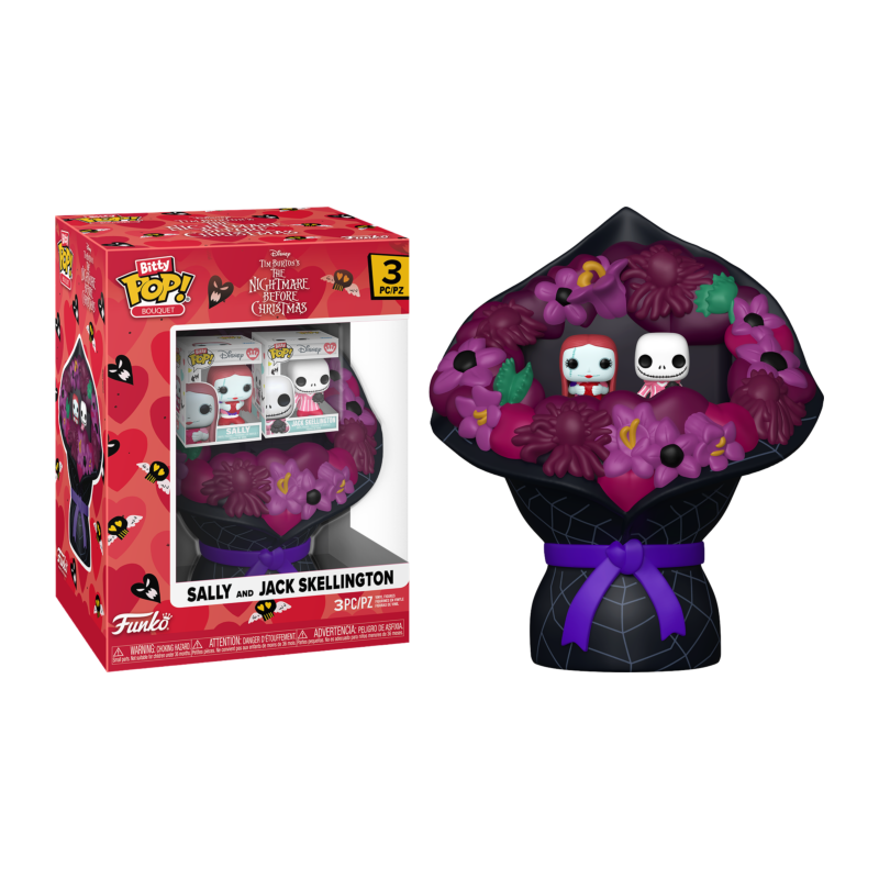 This mini vinyl bouquet features Sally and Jack in a Valentine-themed design, complete with hearts, flowers and playful gothic charm, making it a perfect collectible or gift for loved ones.