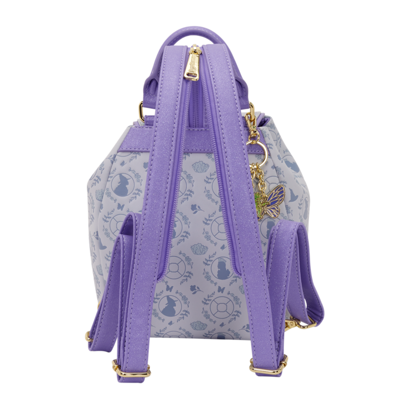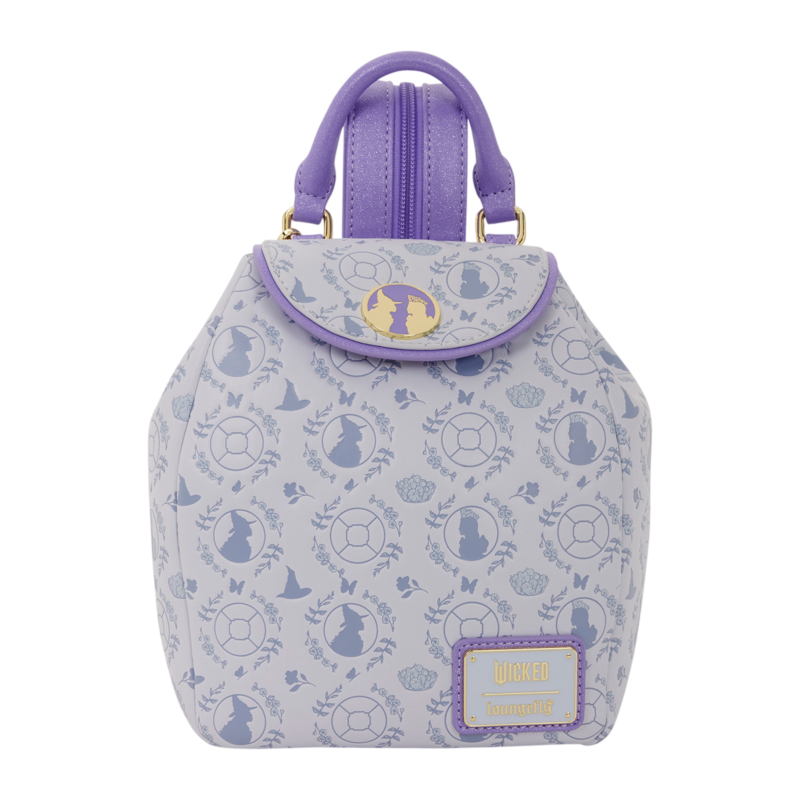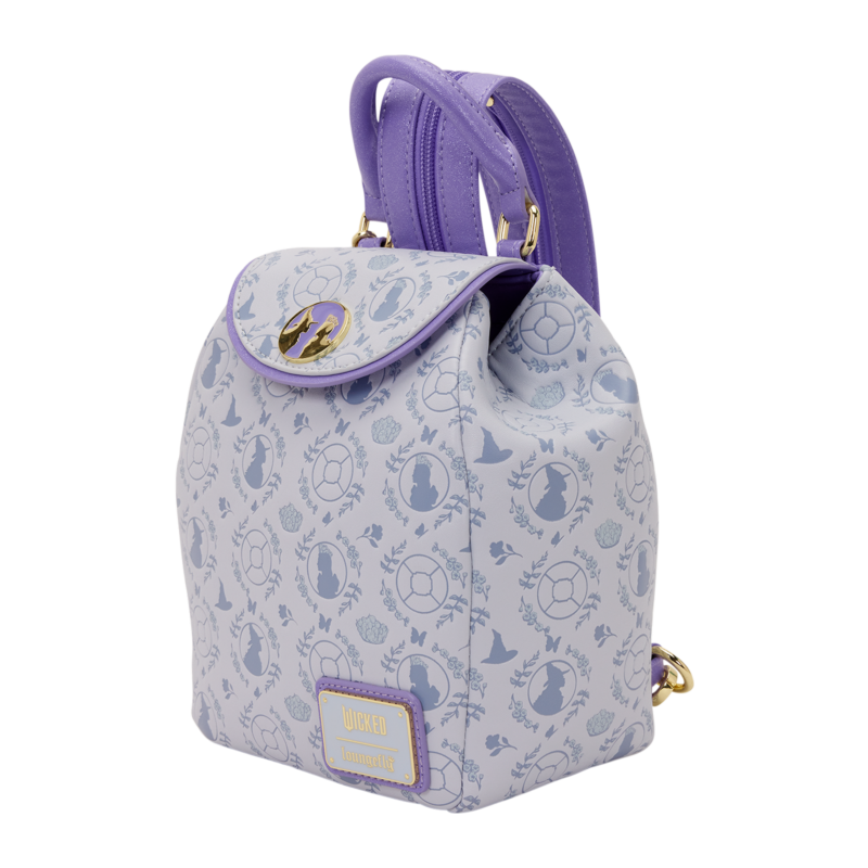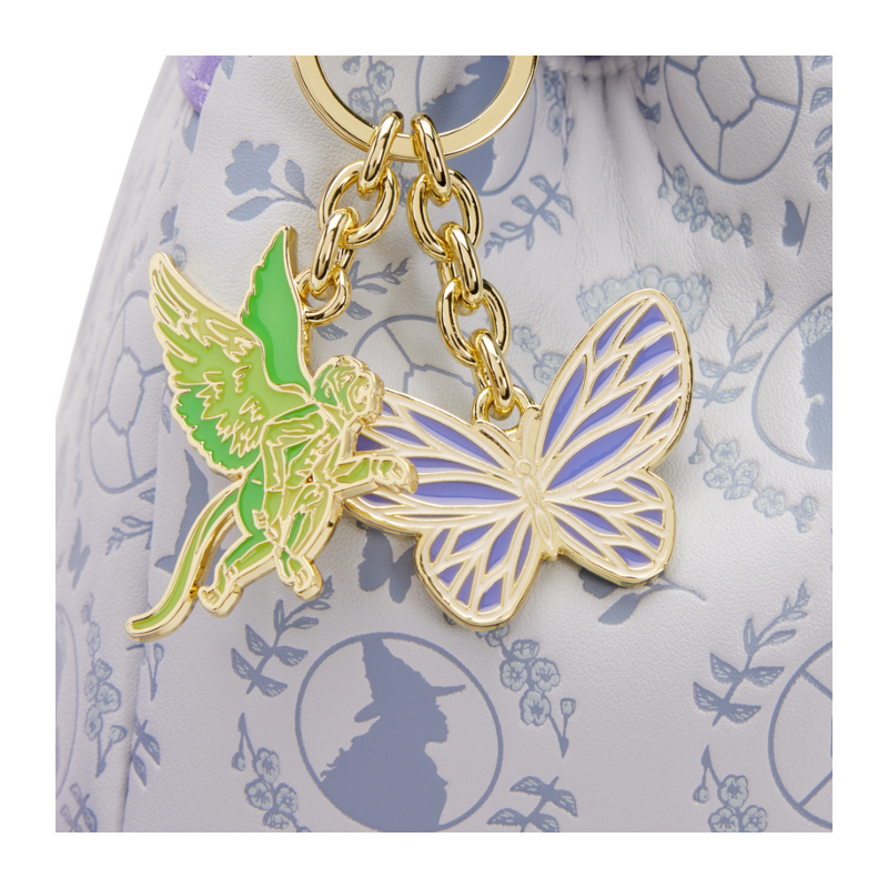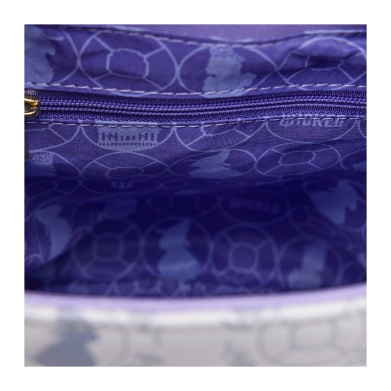 This bag features shimmer material with an embossed pattern showcasing symbols and silhouettes of Elphaba and Glinda. On the top flap, you'll find a magnetic snap closure that features the silhouettes of Glinda and Elphaba. Attached to the bag is a keychain featuring charms inspired by these characters. This bag can convert between a sling or a mini backpack; all you have to do is unzip the strap to make it into two!