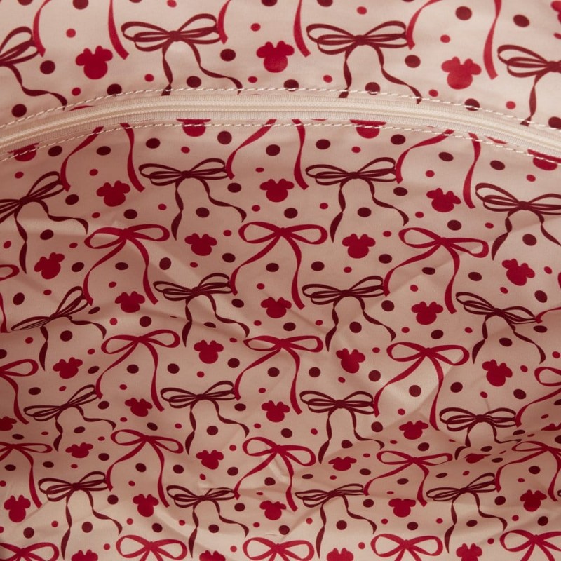 This tote is red and cream. You'll find embossed polka dots all over the bag. You'll also find some polka dots on Minnie Mouse's 3D bow and the straps! The front pocket is in the shape of Minnie Mouse's silhouette. Satin ribbons add an extra sweet touch to the bag! Embody your favorite Disney fashionista with this tote!
