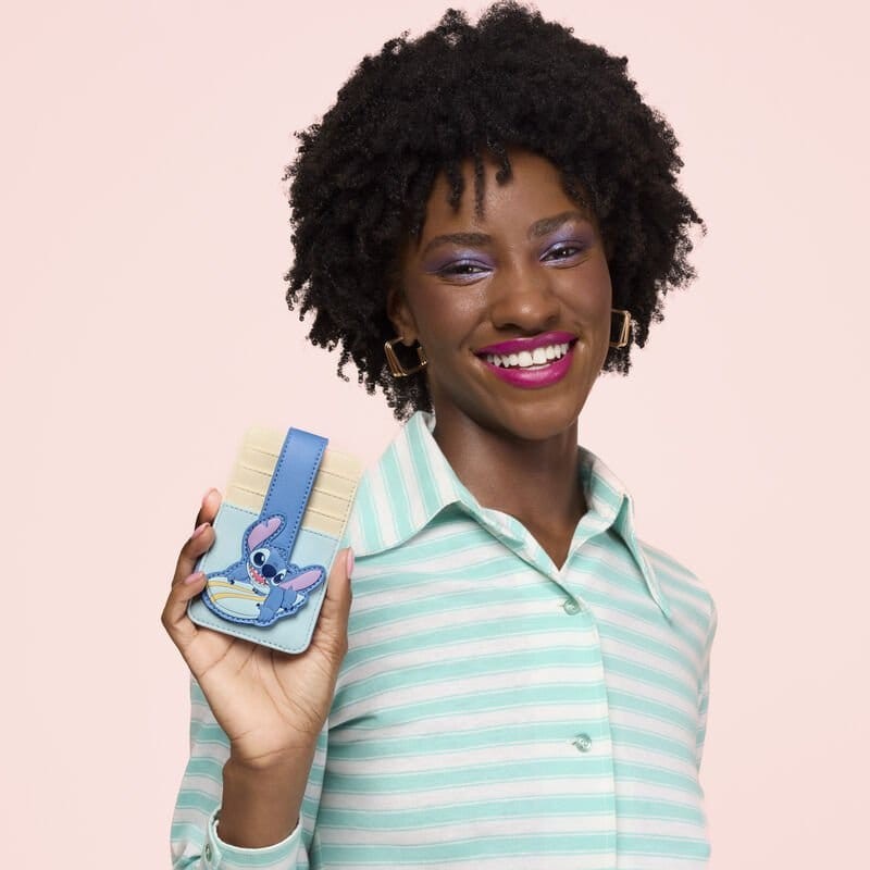 This zip around wallet features Stitch sitting on a rock with a bird resting on his head. A sliver of sunset is visible behind him. Turn the wallet around to find another image of Stitch with the bird. Inside, there are four card slots and one clear ID slot. It's a super cute accessory for any Stitch fan to have throughout their day!