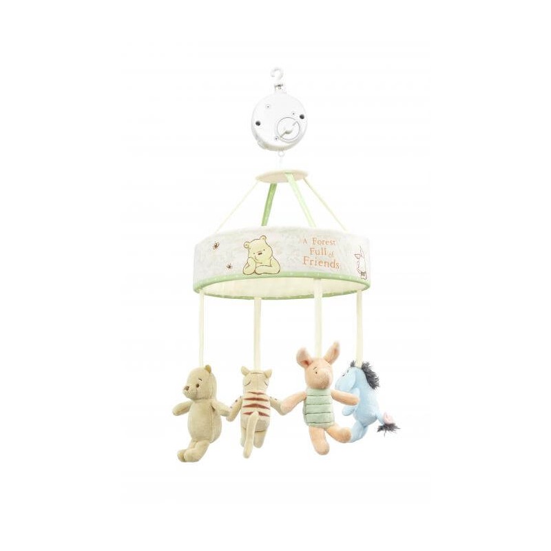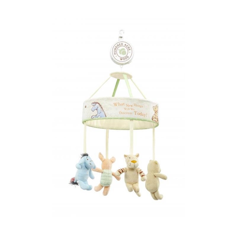 The beautiful Winnie the Pooh Cot Mobile, from the Hundred Acre Wood Collection, will soothe baby off to sleep with music, movement and much-loved characters. This beautiful and essential addition to the nursery features baby soft toys of Winnie the Pooh and his best friends, Piglet, Tigger and Eeyore.