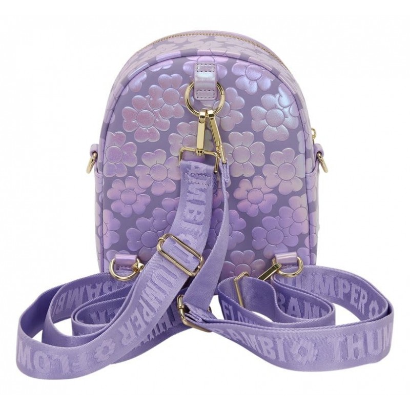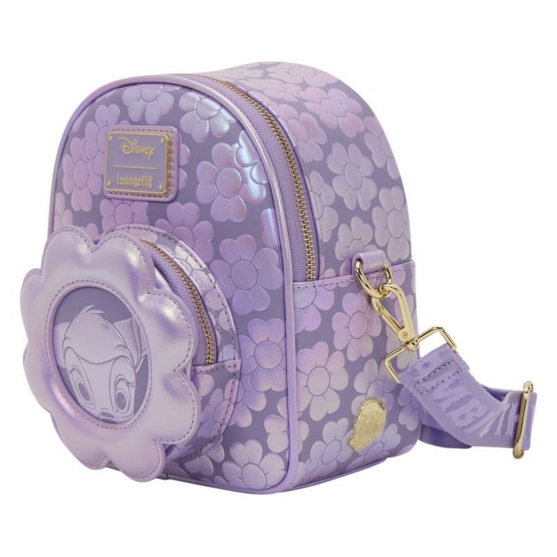 This mini backpack can convert to a crossbody bag, so you have options on how you'd like to wear it! It's iridescent purple all over, with a debossed pattern of flowers. The front pocket features a flower applique with Bambi in the center. Check out the sides and find recessed metal charms of some other fav characters from the movie. Along the strap, you'll find the names "Bambi," "Thumper," and "Flower" written along it.