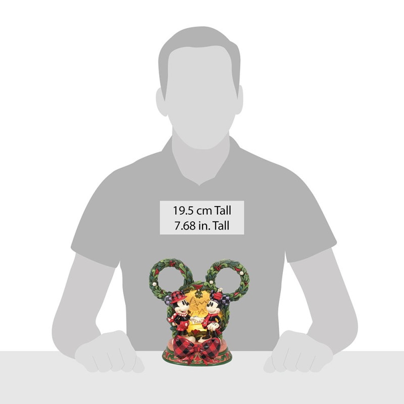 This delightful Jim Shore Christmas scene captures Mickey and Minnie holding hands beneath a glowing LED diorama, framed by a festive Mickey-shaped garland adorned with berries and pearl accents. It radiates seasonal magic with holiday charm.