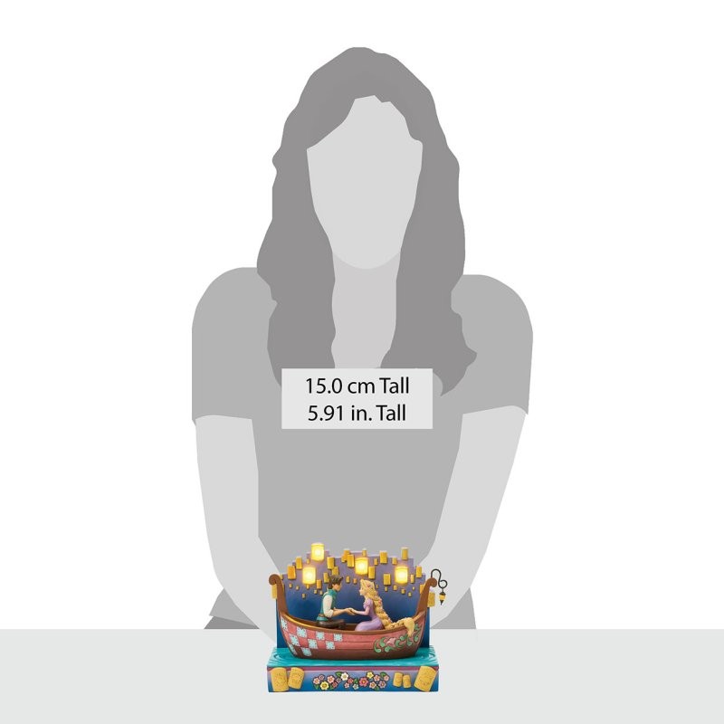 In this beautiful Jim Shore design, Rapunzel and Flynn Rider share a romantic boat ride through glowing LED floating lanterns. Capturing the enchantment, Rapunzel's charm shines with flowers in her hair. The boat features Jim Shore's iconic details. Perfect for celebrating 15 years of Tangled. Automatic timer for lights, 6 hours on, 18 hours off.