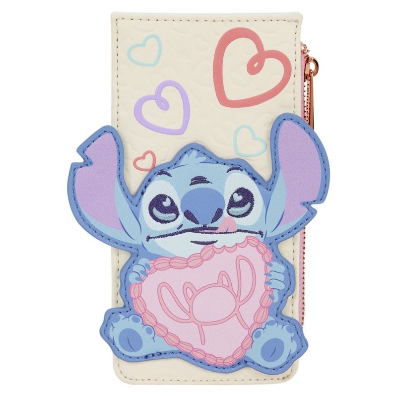 Get ready for Valentine's Day season with this adorable Stitch card holder. You'll find Stitch on the front holding a heart-shaped cake that has Angel's silhouette piped onto it. You'll find a debossed pattern of hearts all over the front and back of the card holder, as well as puff print hearts! Turn it around to find four pink-and-blue card slots.