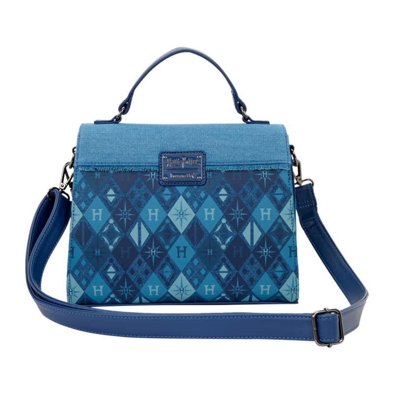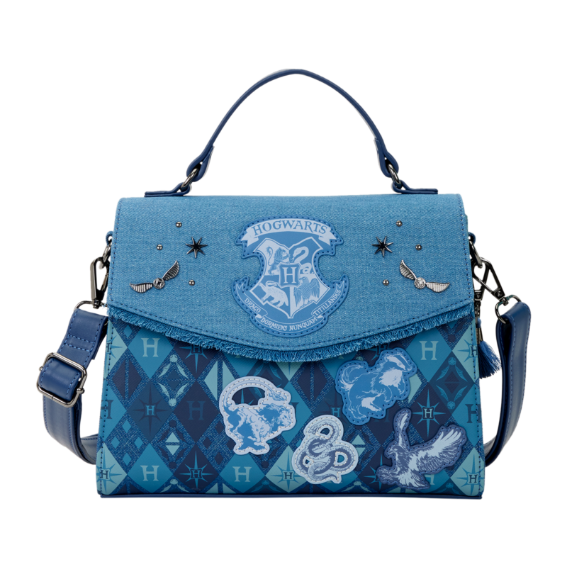 This crossbody bag features faux denim, metal charms, tassels, and fringe! You'll find the Hogwarts™ crest on the top flap of the bag. The body of the bag features an all-blue argyle-type pattern with images of each Hogwarts™ House animal!