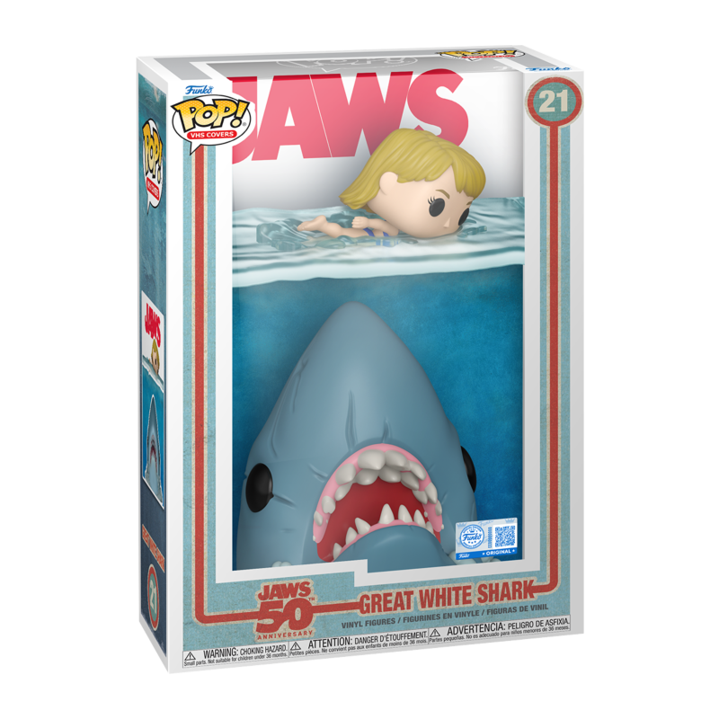 Dive into cinematic history with the Jaws Pop! Covers Vinyl Figure, featuring the terrifying Great White Shark as it appeared on the iconic movie poster. This collectible brings the suspense of Spielberg’s classic to life, showcasing the infamous shark in front of a stylised backdrop of the original Jaws cover art.