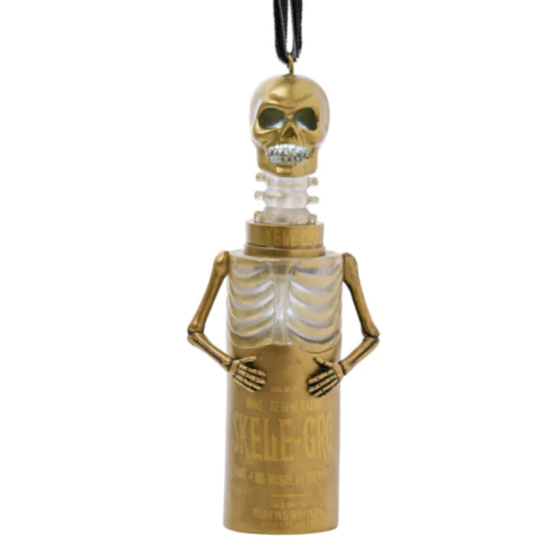 Introducing the Warner Bros Harry Potter Alumni LED Hanging Decoration - Skelegro, a magical keepsake for every Harry Potter fan. The golden skeleton and skull-capped bottle design nod to the potion that regrows bones in the Harry Potter series. LED lights illuminate the Skelegro, adding a touch of magic to any room. Perfect for any Potter fan's collection.