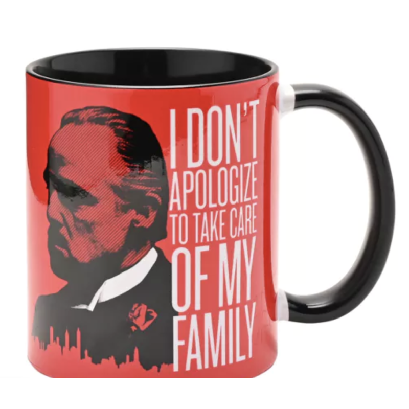 The Fandomania The Godfather 11oz 'Take Care of Family' Mug is a must-have for fans of the iconic film, featuring a striking design inspired by the classic movie. This ceramic mug showcases a powerful portrait and quote set against a cityscape, creating a bold statement piece that captures the essence of The Godfather.