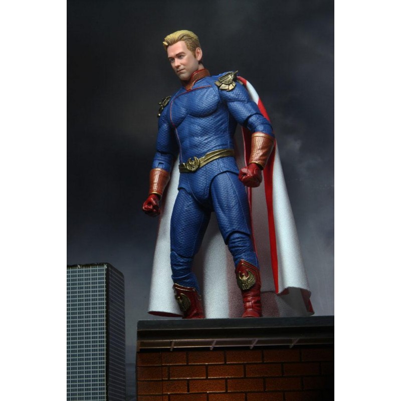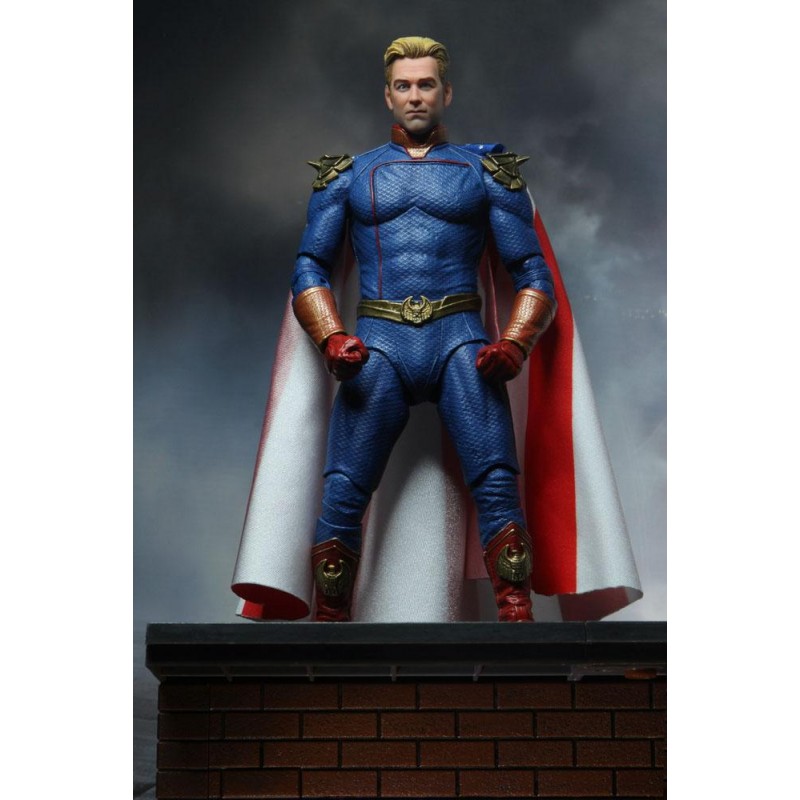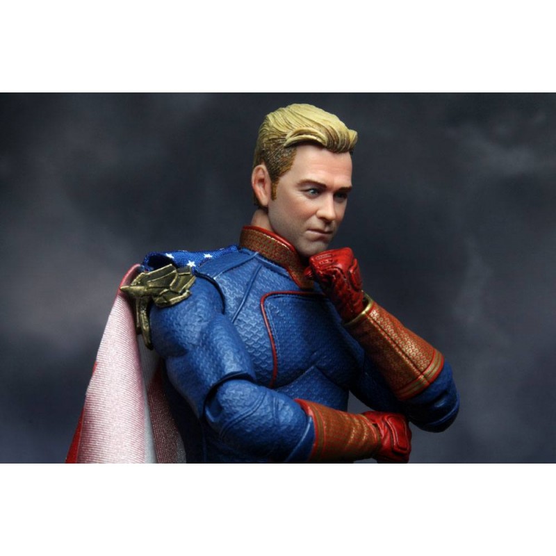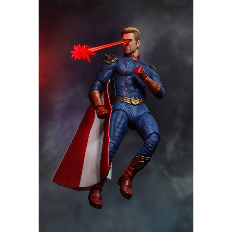 Homelander, the leader of The Seven, has the face of a movie star and the powers of a god, but even gods have secrets... This 7? scale action figure featured a detailed replica of the screen costume that includes a soft goods cape, and comes with interchangeable heads and hands, plus eye blast effect. Collector-friendly window box packaging with opening front panel.