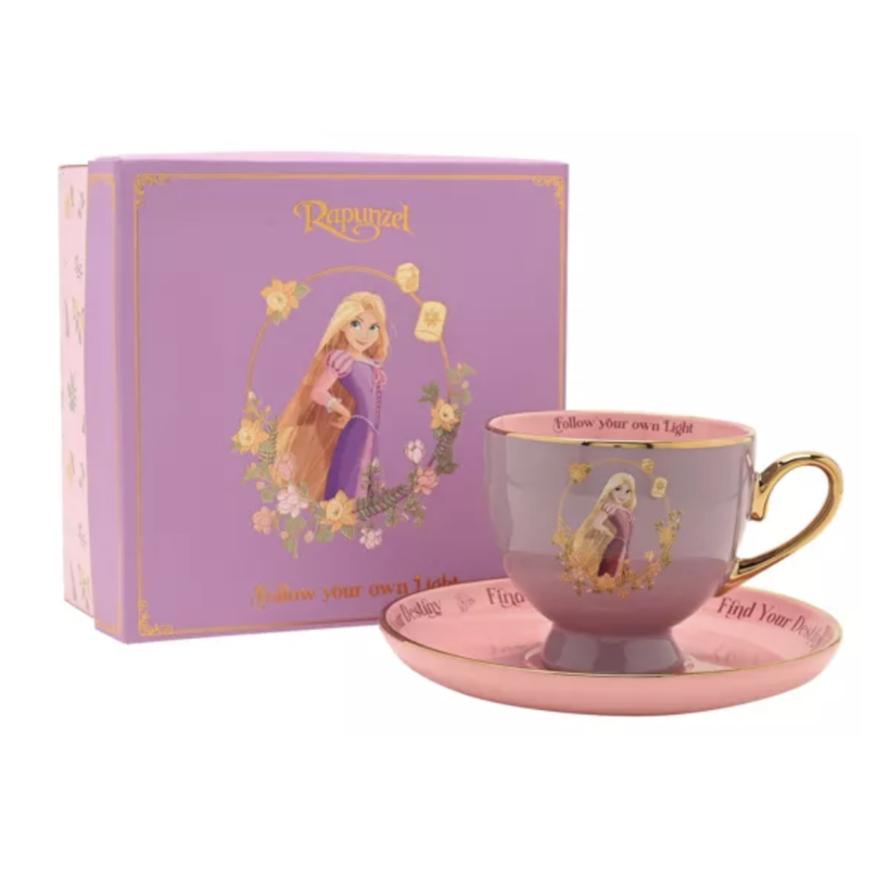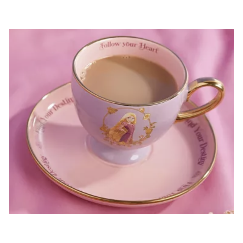 Create a royal tea experience with the Disney Pastel Princess Tea Cup & Saucer - Rapunzel. This charming set features a whimsical blend of pastel pinks and purples with a golden handle and saucer, with an enchanting illustration of the long-haired princess and the inspiring text, "Follow your heart.".