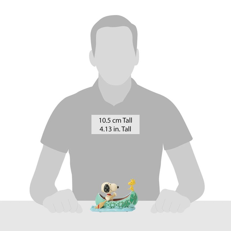 Snoopy and Woodstock embark on an adventure in a charming Jim Shore detailed canoe adorned with the artist's signature patchwork patterns and rosemaling. Snoopy steers while Woodstock guides the way, celebrating teamwork and friendship on the water.