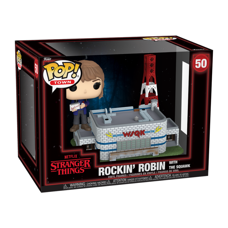 Dark forces are lurking beneath Hawkins, Indiana. Witness the dangerous and supernatural secrets of the Upside Down with Pop! Town Rockin’ Robin with the Squawk! Bring home the happenings, characters, and breakthrough moments of the fifth and final season of Stranger Things by making Pop! Town Rockin’ Robin with the Squawk the next addition to your Pop! Television collection.