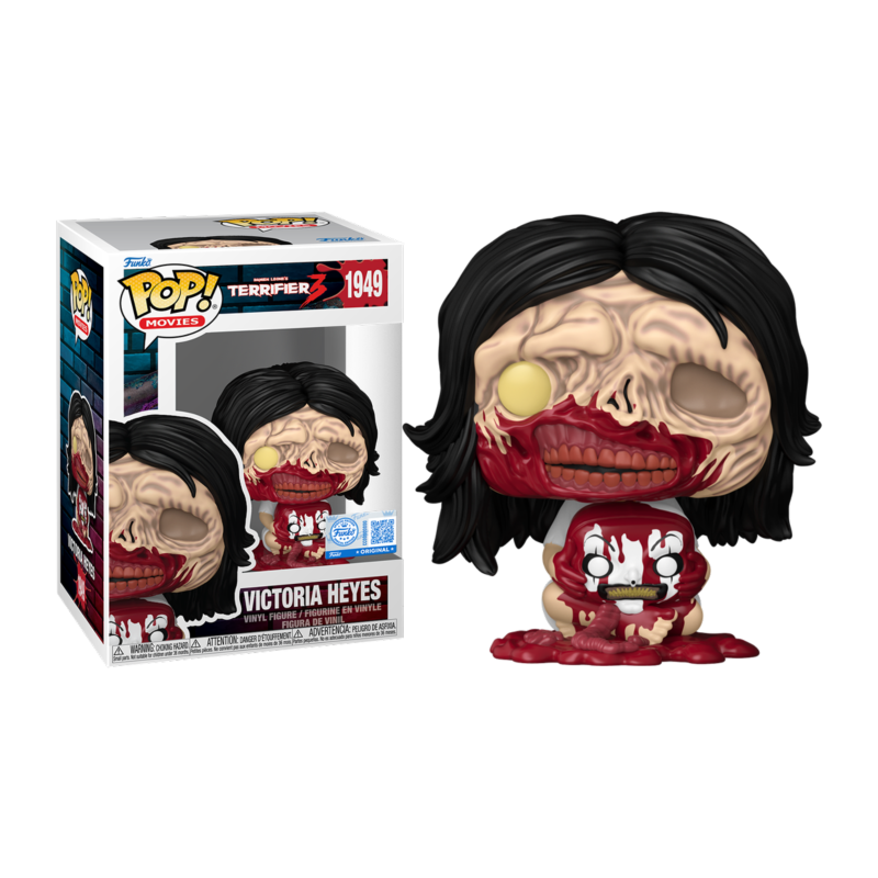 Vicky + Art forever! The exclusive Pop! Victoria Heyes holds Art the Clown’s head in her hands, as seen in the movie Terrifier 3. Make a thrilling addition to your horror collection by inviting Pop! Victoria Heyes to possess your shelves!