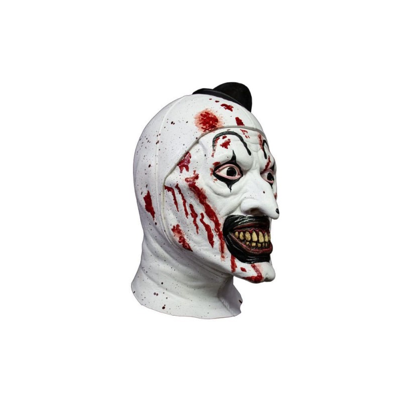 Designed by Russ Lukich. Trick or Treat Studios and Dark Age LLC are proud to present the Official Terrifier Killer Art the Clown Mask! This amazing mask is a perfect version of the makeup worn by Art the Clown in the Cult Classic, Terrifer. Every detail of Art the Clown is included in the mask including his crazy eyes, pointy nose, maniacal grin and bloody face.