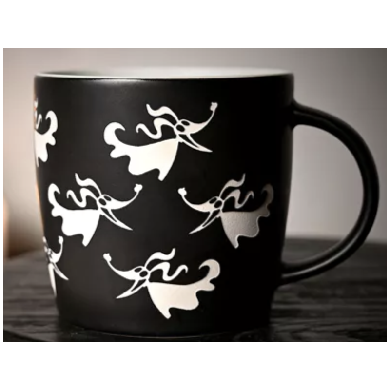 Bring spooky charm to your morning brew with this Disney Nightmare Before Christmas Zero mug. Featuring the lovable ghost dog from Tim Burton's classic film, this black ceramic mug is adorned with a hauntingly beautiful pattern of white floral and leaf-like designs.